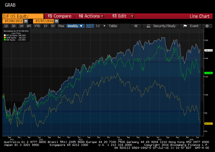 The third chart here looks at the relative performance of three ETFs. The white line is the iShares ETF (IYF) that tracks the Dow Jones financial sector. Over the past five years, it has risen 54%. The yellow line is ETF that tracks the MSCI European Bank Index (EUFN). It has fallen by nearly 30% over the past five years. The green line is the ETF that tracks the S&P Bank Select Industry Index (KBE). It has risen by as much as the EUFN has fallen.