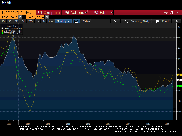 The UK's core measure (white line) has risen from 0.8% in June 2015 to reach 1.5% in both March (before the Brexit-induced slide in sterling) and September 2016. It is above the 12- and 24-month averages for the first time since 2011.
